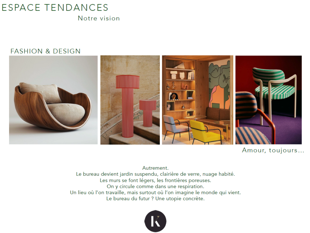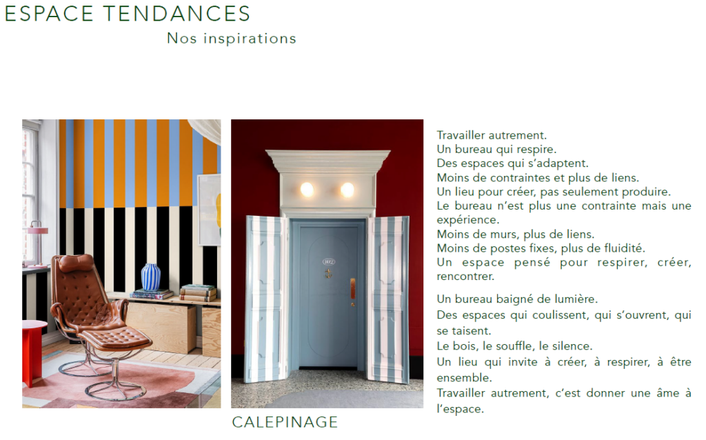 Le bureau devient aussi un lieu de santé et de bien-être. L’acoustique, la lumière naturelle, la ventilation, la présence de végétal et de matières naturelles favorisent l’équilibre physique et mental. On y travaille mieux parce qu’on s’y sent bien. Il reflète également l’identité et les valeurs de l’entreprise. Plus qu’un décor, il raconte une histoire : celle d’une culture partagée, d’une esthétique commune, d’un mode de vie au travail. On ne vient plus seulement “travailler”, on vient participer à une expérience collective.